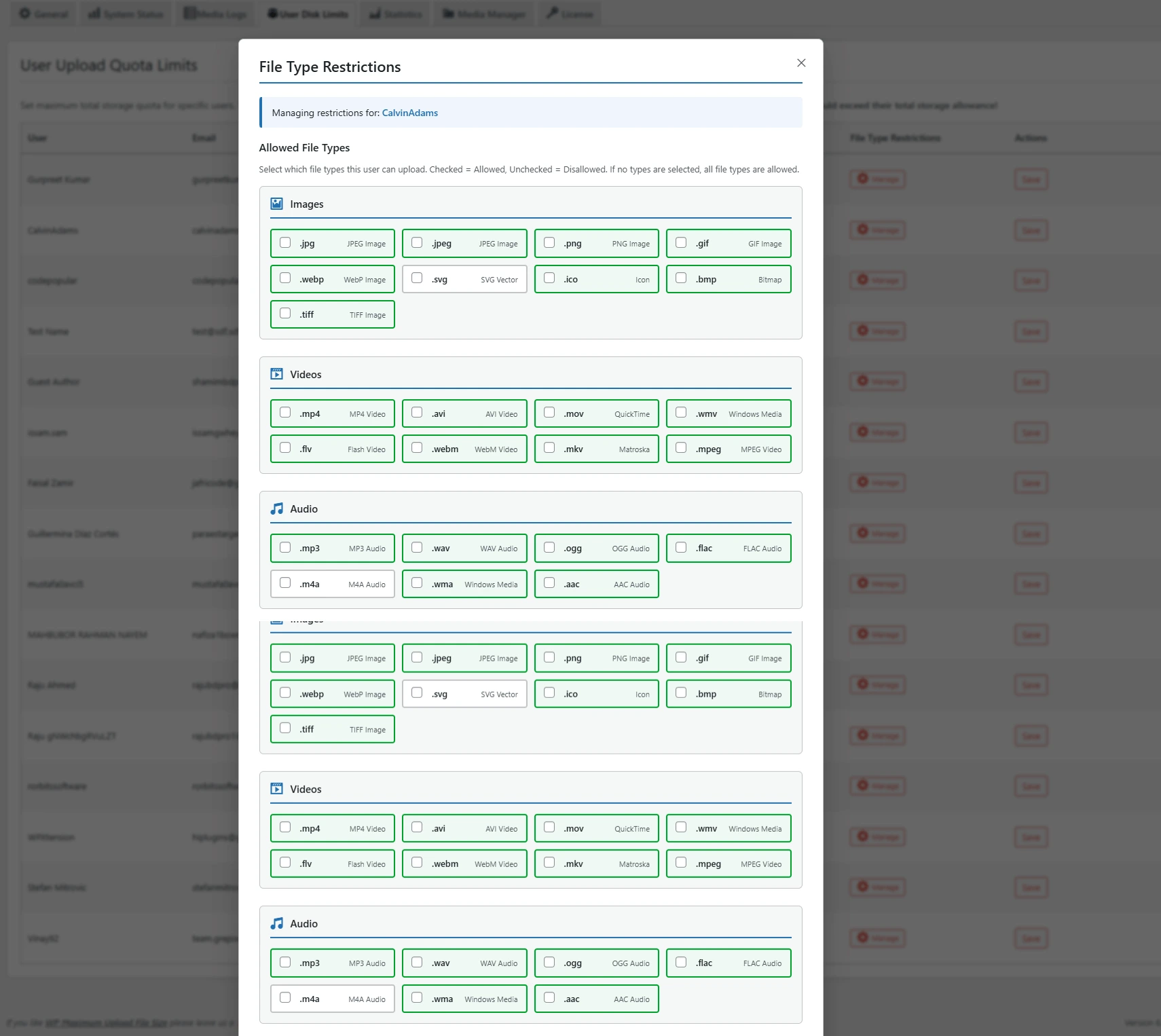 The User File Type Limit feature gives website owners complete control over which file formats users can upload, covering images, videos, and audio files. You can specify trusted formats such as .jpg, .png, .svg, .mp4, .mov, .mp3, and more, ensuring that only approved files are added to your website.